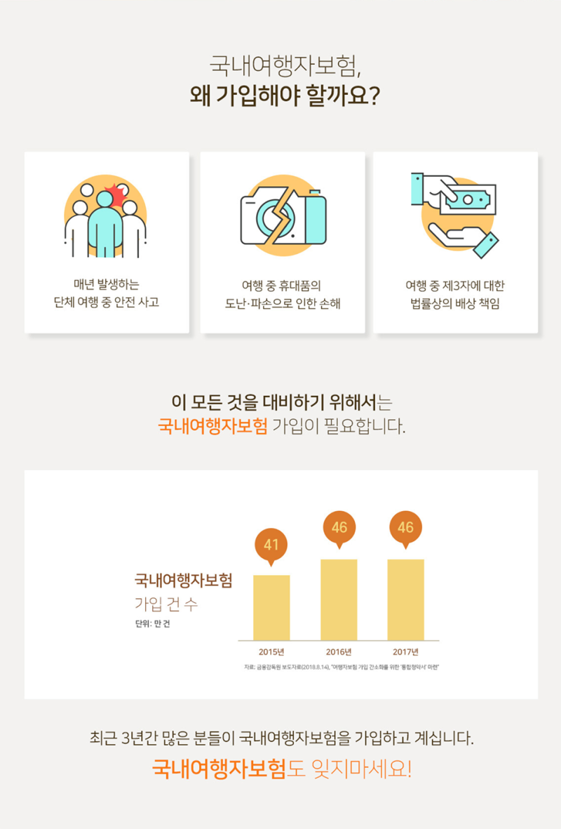 국내 여행 중 발생하는 상해 질병에 대비한 여행자 보험 비교는 투어 모즈가 편합니다! 저는 국내 여행이나 해외 여행 시에도 이곳을 통해 보험을 비교하고 가입합니다.너무 초보자분들이 보기 쉽게 구성되어있어서 한눈에 알아보기 쉽거든요.링크 걸어드릴테니 필요하신 분들은 참고해주세요!>>>