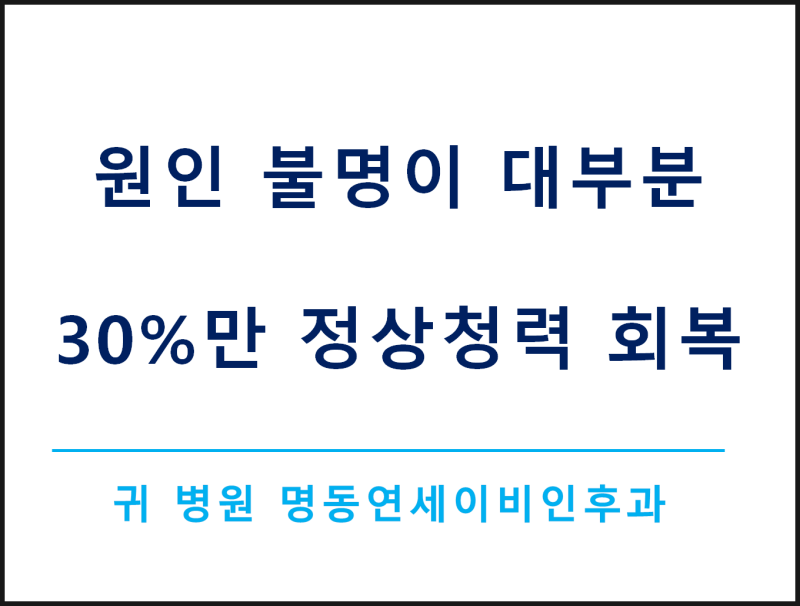 ★이러한 돌발성 난청이 의심되면 빠른 진단을 받아 조기 치료를 하는 것이 좋습니다!1~2주 이내에 적절한 돌발성 난청 치료를 받은 경우 70% 내외의 환자가 청력 회복을 하지만 시간이 지나면 급격히 회복률이 떨어져 청력에 영구적인 손상을 줄 수 있습니다. 조기에 발견할 경우 예후가 좋다고 하니 골든타임을 놓치지 말고 청력에 불편이 있을 경우 신속하게 진단받으세요! ★