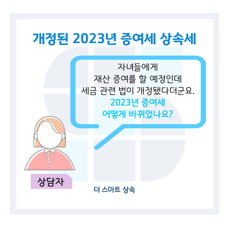 안녕하세요 대표님 상속세 절세를 도와드리는 세무회계 테헤란입니다. 2023년 1월을 맞이하여 1월 1일부터 개정된 상속세에 대해 소개하고자 합니다. 작년부터 상속세와 증여세가 개정될 예정이라고 떠들썩했는데요. 어느덧 2023년에야 개정된 소식을 전할 수 있게 되었네요. 공제한도 확대나 인적공제 대상 등 생각보다 다양하게 추가된 항목들이 있으니 주의해서 읽어보시기 바랍니다. 글을 읽어보시고 상속세 또는 증여세 관련 문의가 있으신 분은 세무회계 테헤란으로 연락주세요. 저희는 세무장뿐만 아니라 재산세를 전문으로 조력하는 세무사가 상주하고 있어 상담이 가능합니다. 상담이 필요한 경우 아래 링크를 참고하시기 바랍니다.