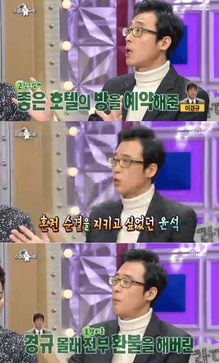하지만 이윤석은 결혼 전 순결을 지키고자 이경규 몰래 호텔 방을 갚았고, 큰 이슈가 됐다.