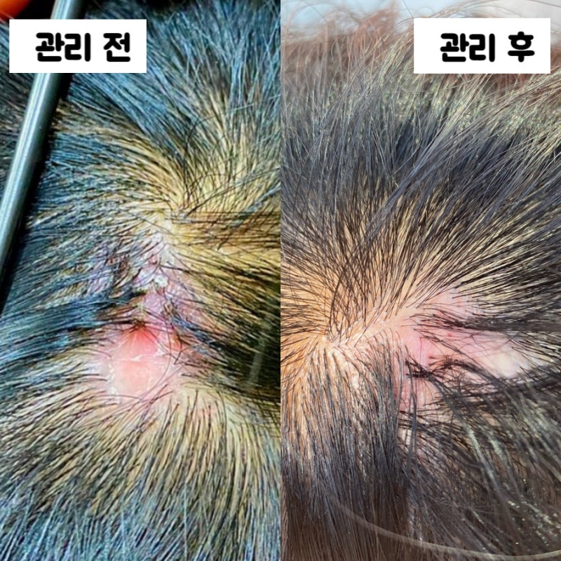 비포&애프터 염증이 없어요~ 비포 사진을 보시면 모낭염 치료 후 변화가 보이시는데 정말 많이 좋아지셨어요. 시술전 염증과 두피각질이 심했는데 2주차부터 급격히 호전되긴 했지만 흉터는 여전합니다. 약간의 잔여물이 보이고 4주차가 된 지금 염증이 거의 사라지고 붉음만 남아있는 것을 확인할 수 있습니다. 창원에서 두피모낭염잘하는곳 찾다가 몇번 실패하고 드디어 WT법을 찾았고 상담후에 변화의 과정이 너무 다른걸 봤습니다. 사실 원장님께서도 완전한 치유는 어려울 수 있다고 하셨지만 이 상태라면 아직은 기대할 수 있는 치유법이라고 생각합니다. 앞으로의 변화가 더욱 기대가 됩니다.