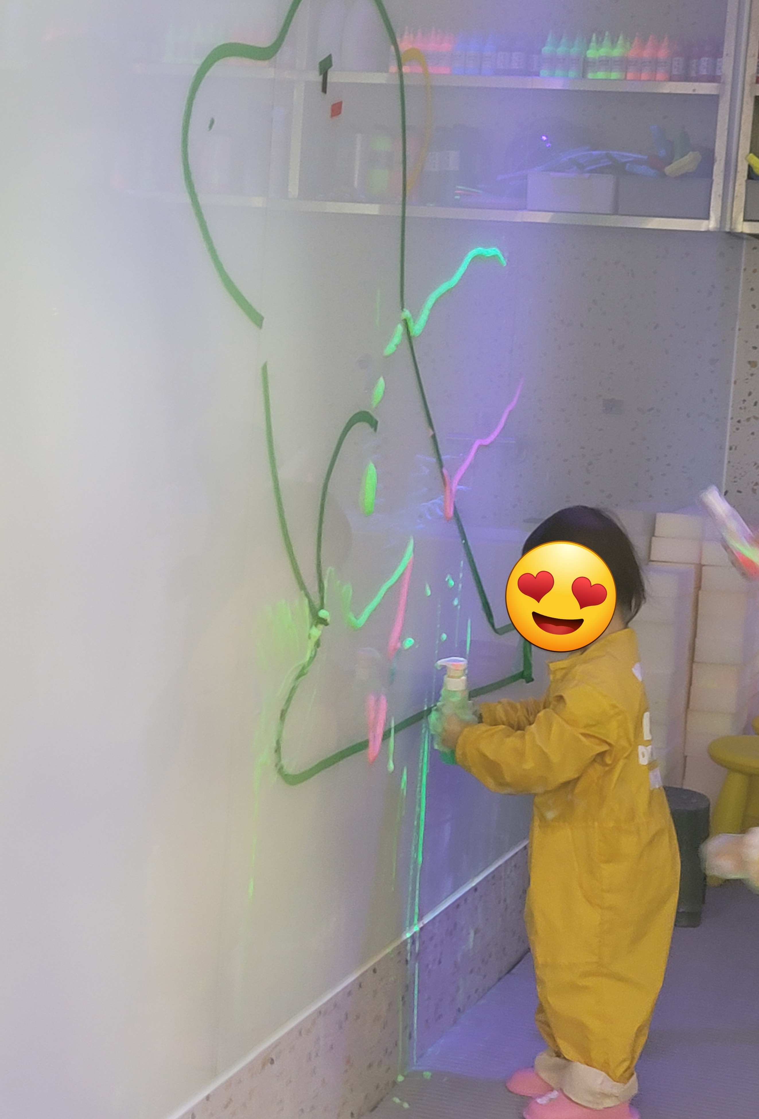형광페인트로 자유롭게 벽에 그림을 그리기도 했는데 집에서 할 수 없는 활동이라 더 설렜다.