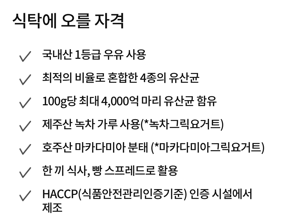국산 우유 품질 1등급그리고 100g당 최대 4000개의 유산균그것은 포함되어야합니다