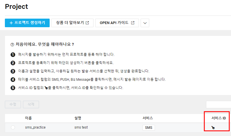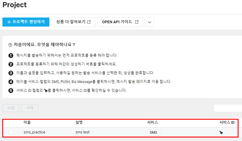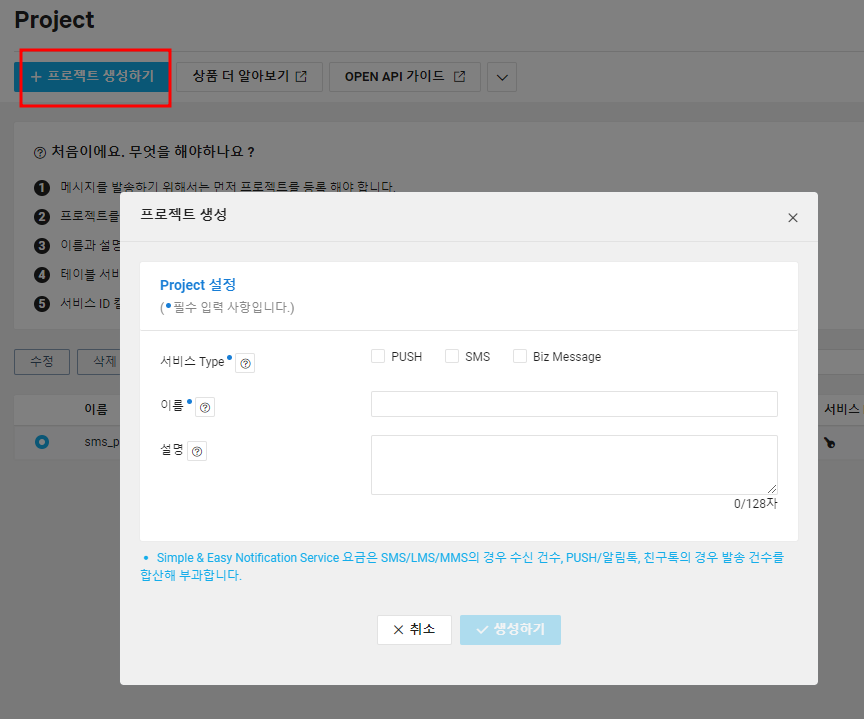 프로젝트 만들기를 클릭하고 생성에 필요한 프로젝트 이름을 입력한 다음 서비스 유형으로 SMS를 클릭합니다.